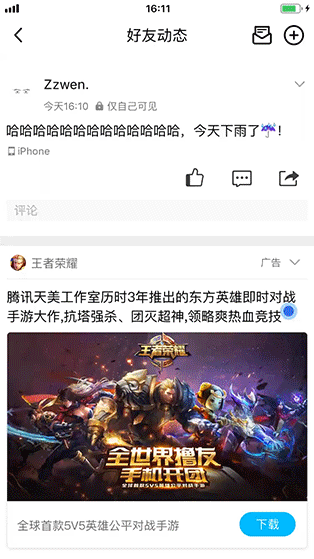 QQ空间广告出现在用户的好友动态中,是一种融入在用户UGC中的原生社交广告,拥有用户天然、无违和感的关注,非常适合品牌在社交场景于年轻人沟通。位置:首页信息流第三条:位于首页第三条位置,穿插在好友动态中,具备高度原生、低打扰的特征,支持全开放式评论:评论全员可见,可置顶5条优质评论;有品牌页卡是视频故事两种展示形态。