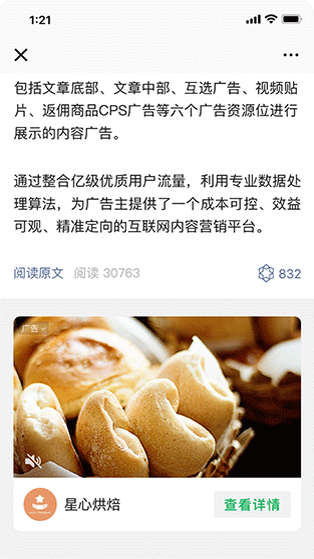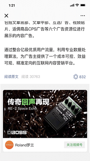 是基于微信公众平台生态,以类似公众号文章内容的形式在包括文章底部、文章中部、互选广告和视频贴片等四个广告资源位进行展示的内容广告。